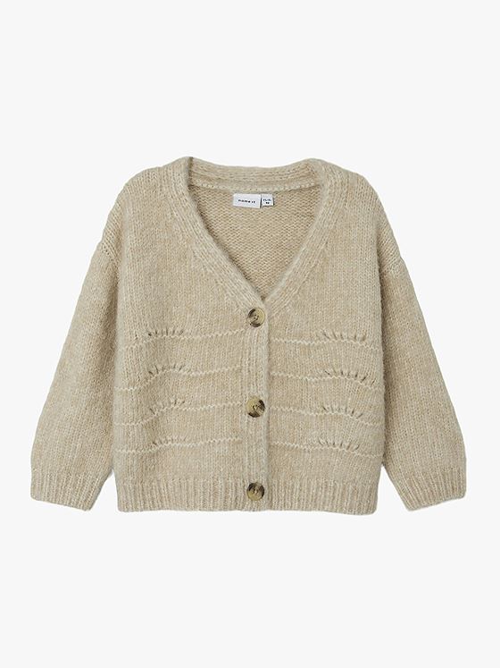 Denne cardiganen er en ekte garderobefavoritt med sin tidløse design og komfortable passform. Den kommer med lange ermer og en elegant V-hals som gir et rent og stilfullt uttrykk. Brede ribbekanter og knappelukking foran gjør den både funksjonell og trendy. Den myke kvaliteten gjør at barnet ditt vil føle seg like bra som de ser ut.
